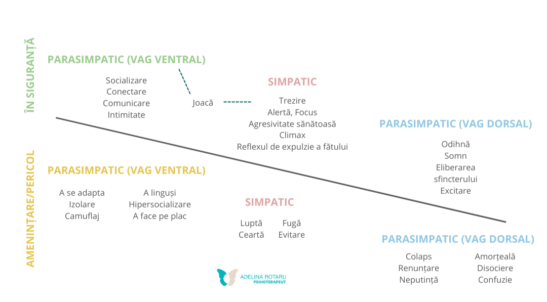 Fără ca noi să fim conștienți, se activează la nivel neurobiologic comportamentele prosociale (conectarea cu ceilalți - vagul ventral) când ne simțim în siguranță sau comportamente de apărare, când nu ne simțim în siguranță. Chiar dacă la nivel cognitiv nu suntem conștienți de amenințare, la nivel neurofiziologic, corpul deja începe procesele care să faciliteze comportamentele de apărare - lupta, fuga sau înghețul (imobilitatea tonică).