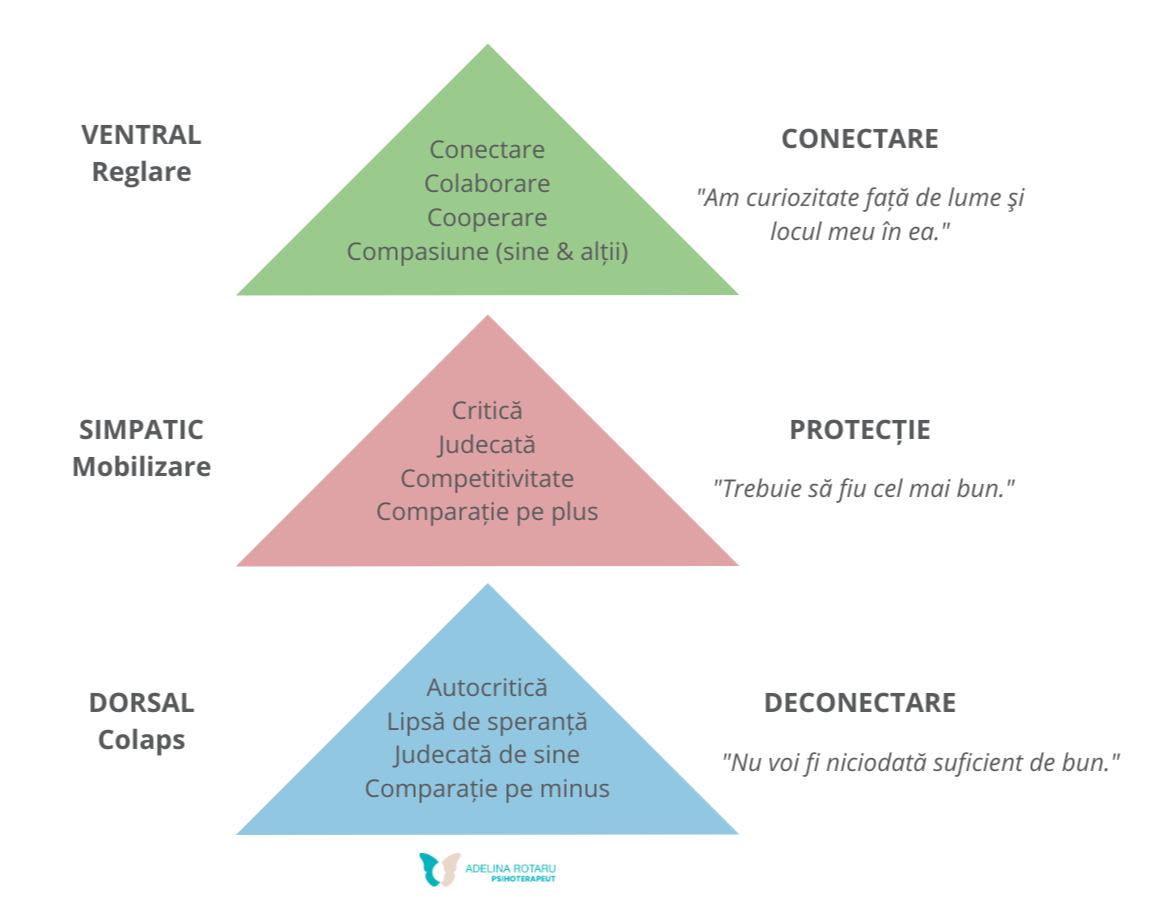 - Răspunsul de angajare socială – cel mai recent din punct de vedere evolutiv, bazat pe funcționarea nervului vag ventral, care facilitează conectarea și cooperarea.