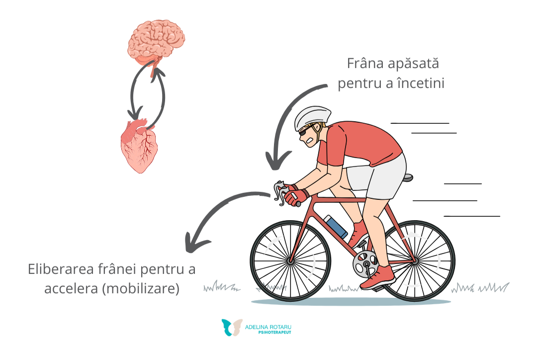 Pentru a înțelege cum funcționează frâna vagală, ne putem gândi la frânele de mână de la o bicicletă. Când cobori un deal și vrei să mergi mai repede, eliberezi ușor frânele, iar roțile se învârt mai repede. Apoi, când vrei să încetinești, apeși ușor pe frâne.