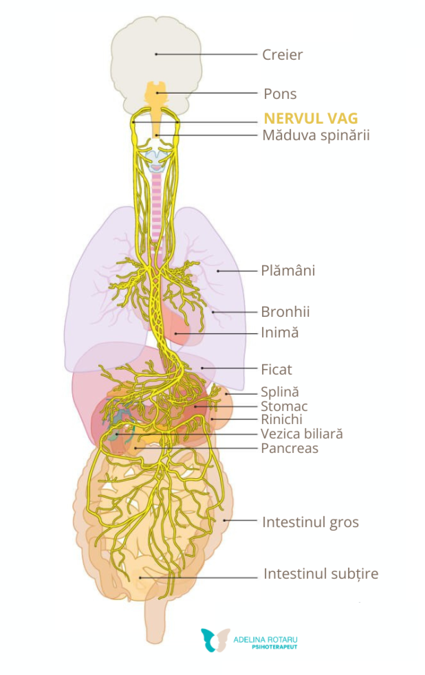 2. vagul dorsal (în zona de jos), întinzându-se din trunchiul cerebral, de la baza craniului, în două direcții: în jos prin plămâni, inimă, diafragmă, sistemul digestiv și în sus pentru a se conecta cu nervii din gât, ochi, și urechi.