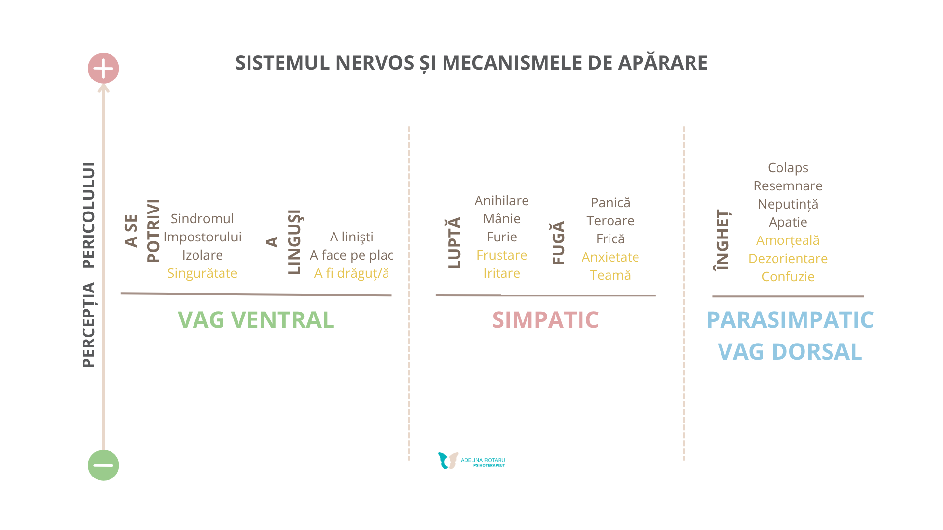 - Răspunsul de freeze (cu activare simpatică, dar imobilizare) urmat de cel de imobilitate tonică - colaps, care este cel mai vechi mecanism de apărare, dependent de nervul vag dorsal, regăsit la vertebratele primitive.