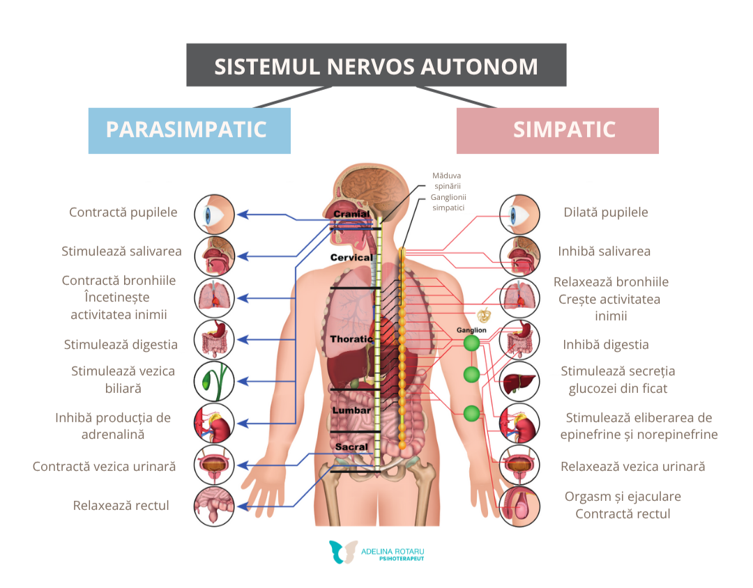 Pentru a înțelege mai bine propriile reacții și modul în care funcționează organismul, este important să cunoaștem câteva aspecte despre sistemul nervos autonom (SNA). Acesta funcționează fără control conștient și influențează diverse procese din corp, precum digestia, respirația, transpirația, ritmul cardiac, excreția și excitația sexuală.